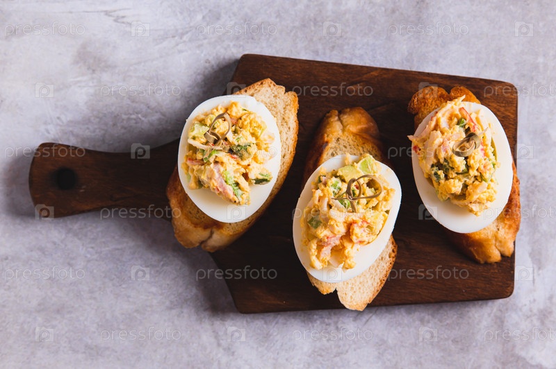 Покройте яйца помидорами и авокадо на тосте на верхней доске