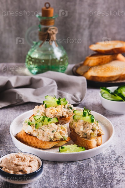 Вкусные бутерброды со салатом из рыбьей печени, яйцами и огурцом на тарелке на столе вертикальный вид