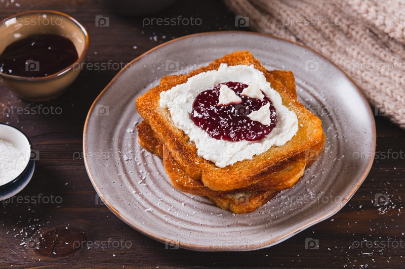 Вкусный тост со сливочным сыром, варенем, пастилем и кокосовыми хлопьями на тарелке на столе