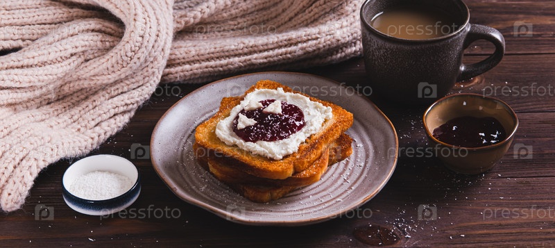 Сладкий тост с рикотой, ягодным вареньем и пастилем на тарелке за столом