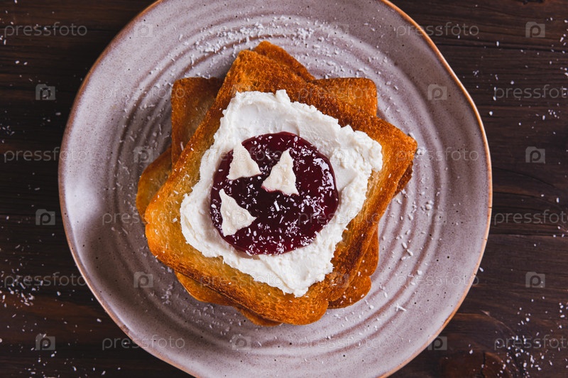 Завершая сладкие тосты с рикотой, ягодным вареньем и пастилем на тарелке с видом на верхний кусок стола