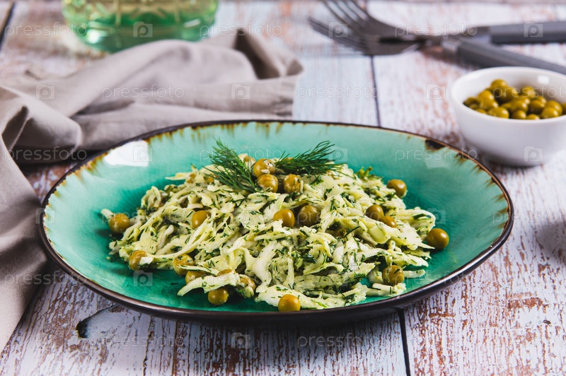Зеленый салат с капустой, горохом и укропом на тарелке на столе
