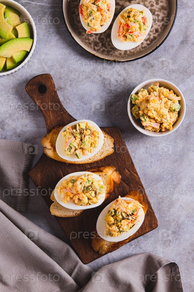 Канапе с дьявольскими яйцами на тосте на доске на столе и с вертикальным видом