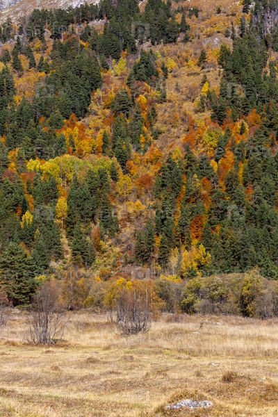 Ландшафт крутого горного склона покрыт красочными лиственных и хвойных деревьев.Путешествие в Домбай, горы Северного Кавказа в солнечный осенний день