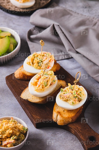 Канапе с дьявольскими яйцами на тосте на доске на столе вертикальный вид