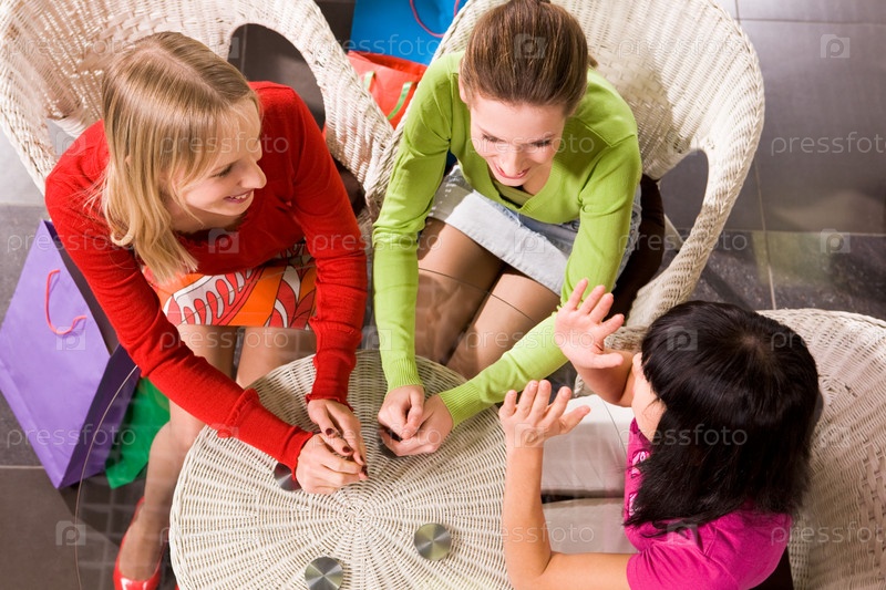 Фото счастливых девушек, беседующих в кафе после покупок