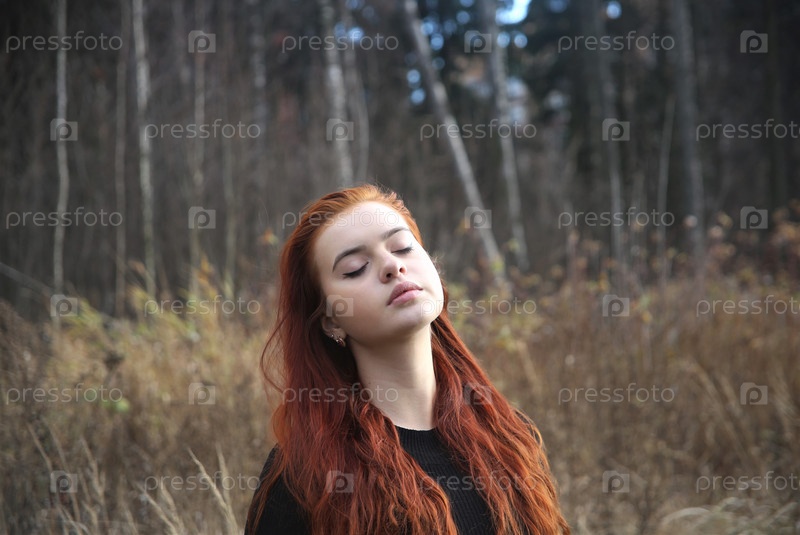 Молодая женщина в черном свитере и красных волосах гуляет по поле