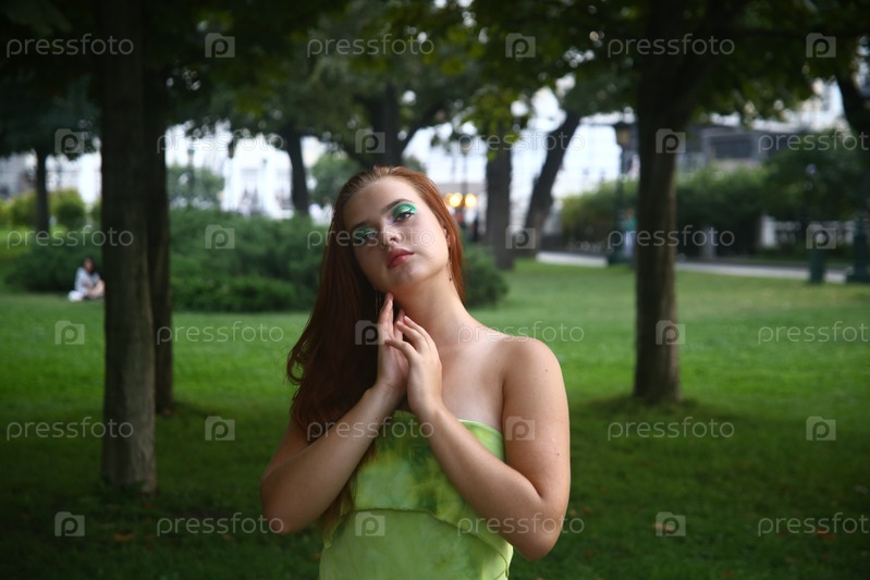 Красивая девушка в зеленом платье позирует в саду среди деревьев