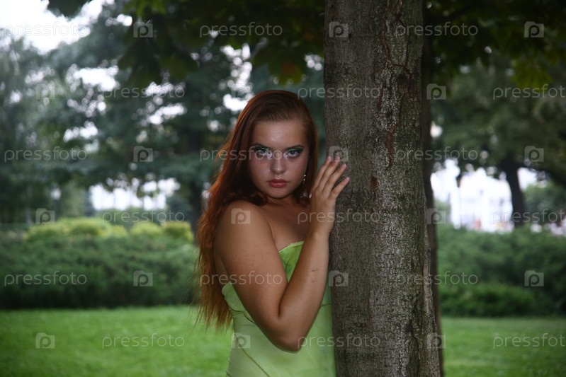 Красивая стильная девушка в зеленом платье позирует в саду