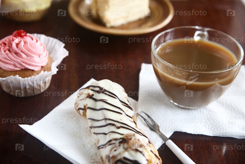 Вкусный торт eclair, кексы с ягодами и чашка кофе на столе