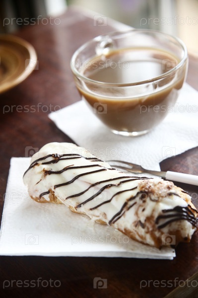 Вкусный торт eclair с чашечкой кофе на столе