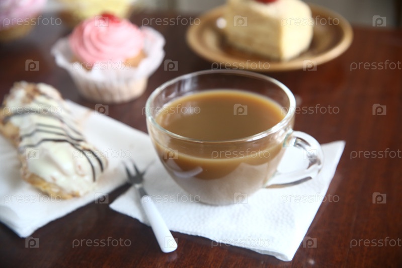 Кофе с молоком и тортовая корзина и эклер в шоколаде