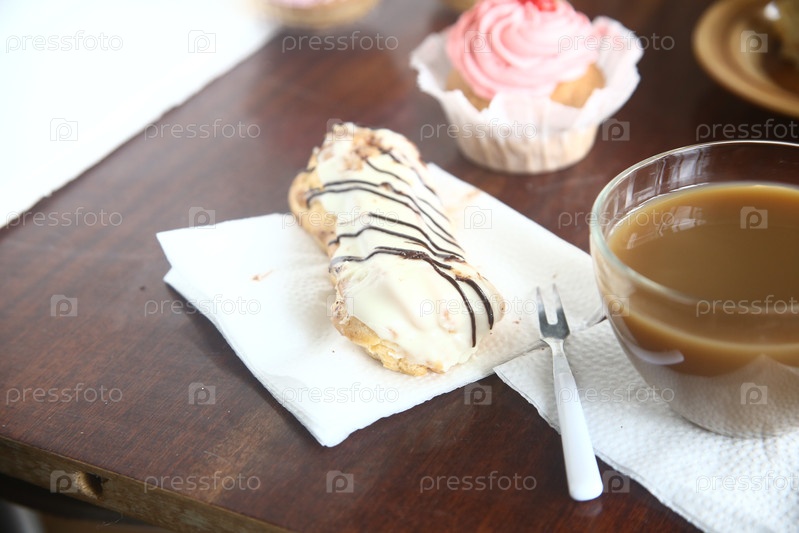 Вкусный торт eclair с чашечкой кофе на столе