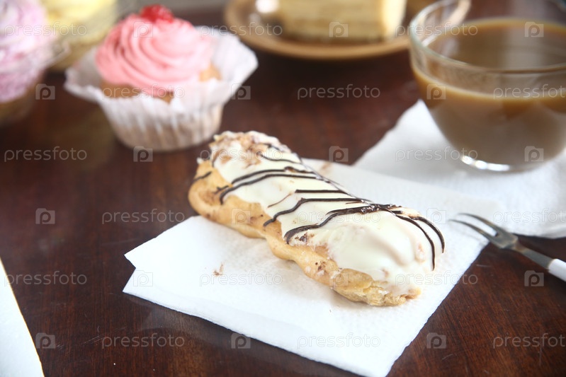 Вкусный торт eclair в шоколадной глазури с чашей кофе на столе