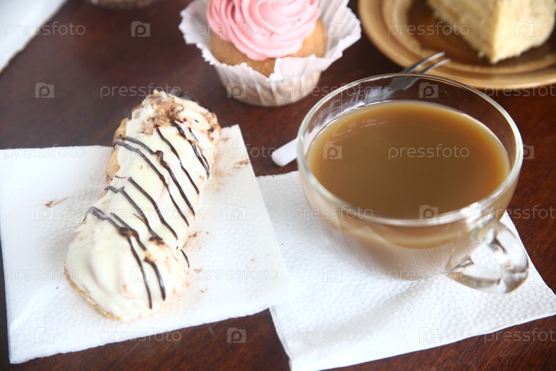 Вкусный торт eclair с чашечкой кофе на столе