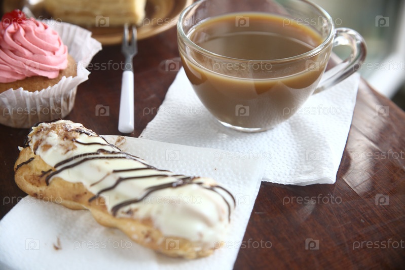 Вкусный торт eclair с чашечкой кофе на столе