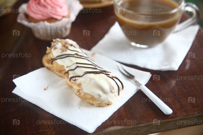 Вкусный торт eclair с чашечкой кофе на столе