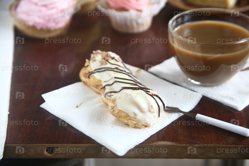 Вкусный торт eclair с чашечкой кофе на столе