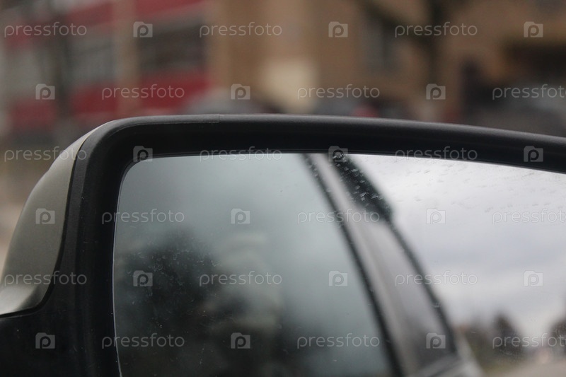 Отражение в боковом стекле из автомобиля и вид на часть улицы