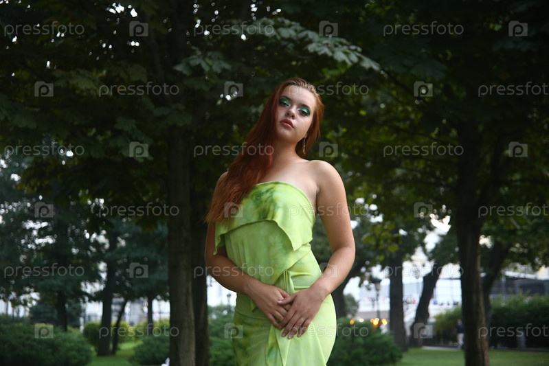 Красивая стильная девушка в зеленом платье позирует в саду