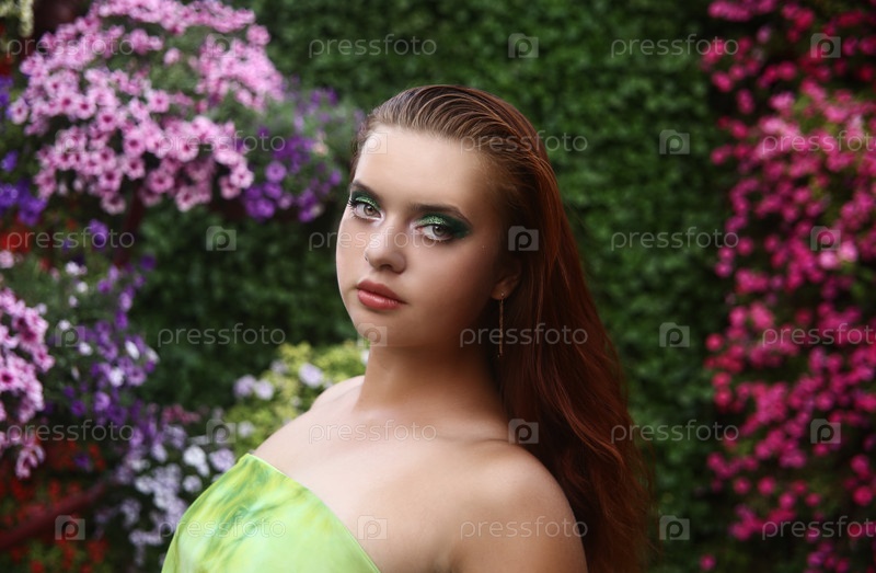 Красивая стильная девушка в зеленом платье позирует в саду