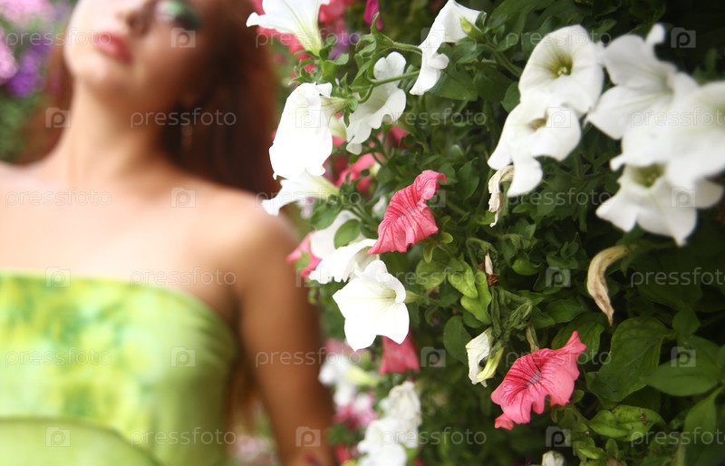 Красивая стильная девушка в зеленом платье позирует в саду