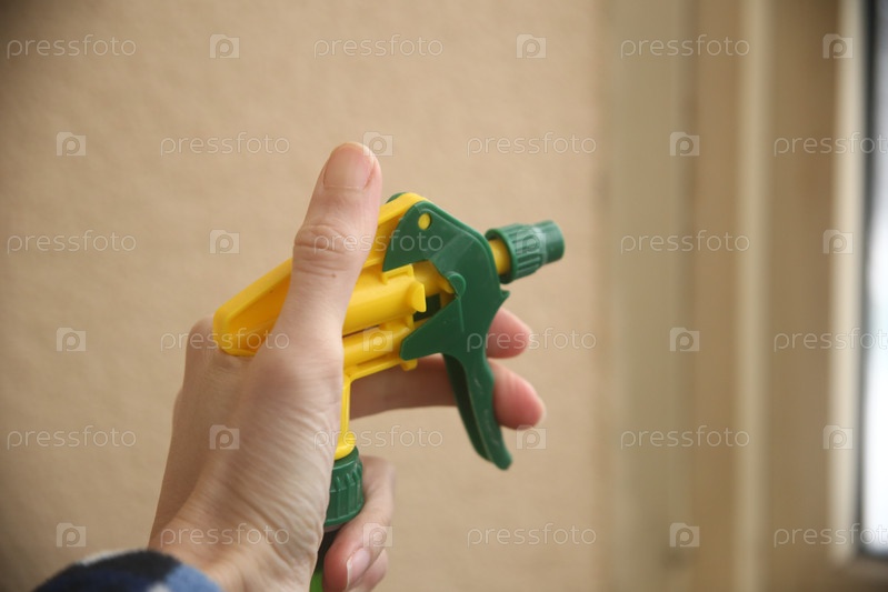 Женская рука делает влажную чистку окон с помощью распылителя воды