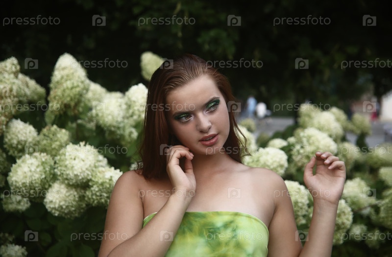 Красивая стильная девушка в зеленом платье позирует в саду