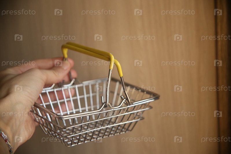 Женская рука держит небольшую корзину для покупок в магазинах