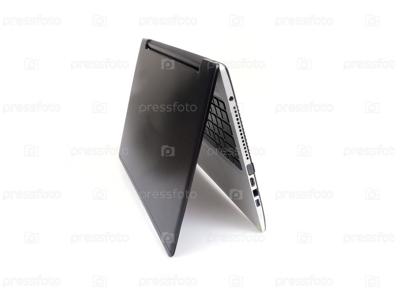 Современный ноутбук частично открыт на белом фоне в изоляции, вырез готов. очень высокое разрешение