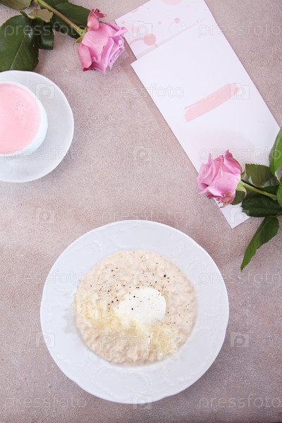 Овсянка с яйцами и пармезанным сыром. Букет роз на столе. Здоровое питание. Концепция завтрака. Плоская. Вид сверху. Копировать пространство