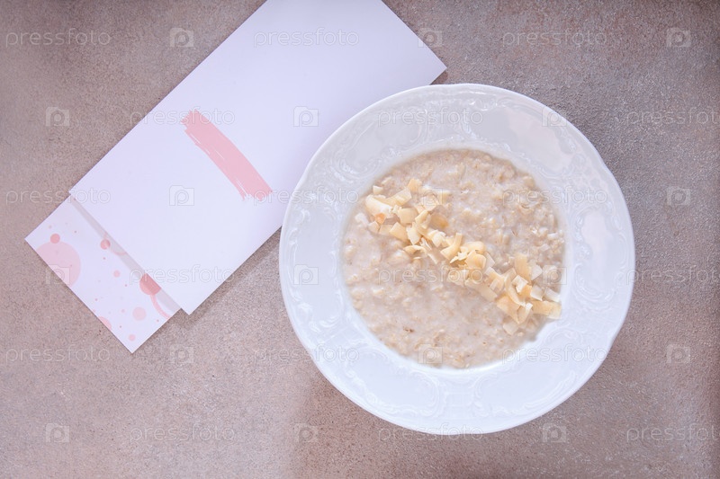 Овсянка и браконьерское яйцо на белой тарелке. Концепция здорового питания. Меню кафе. Плоскость. Вид сверху. Копировальное пространство