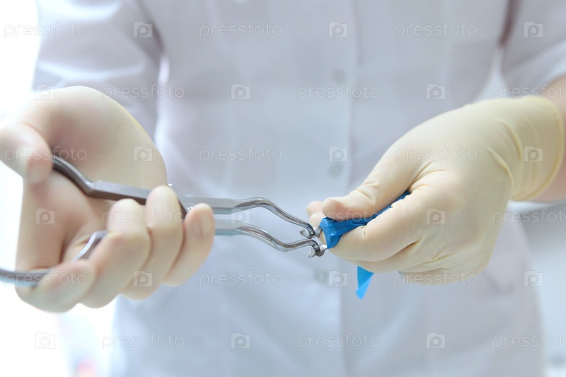 Коффердам в руках стоматолога. Стоматолог держит латексную эластичную пластину в своих руках. Выведение одного или нескольких зубов перед процедурой. Защита мягких тканей рта от контакта с инструментами