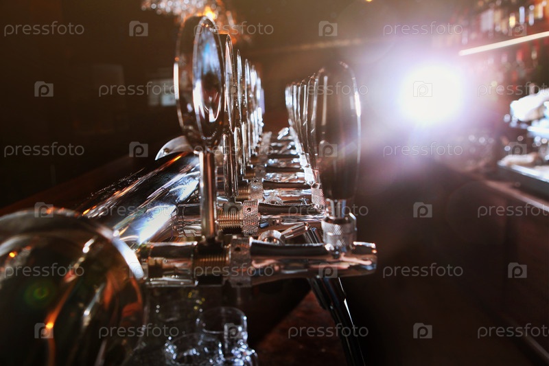 Пиво в пабе. Блестящие стальные ленты для пива. Винтажный стиль. Пивные ремесла. Барной стол. Никто. Выборочный подход. Концепция алкоголя
