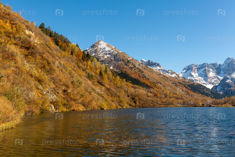 Озеро Киль на фоне высоких скалистых, заснеженных гор и лесистых склонов туман