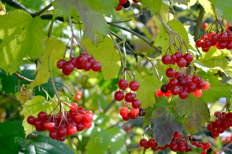 Красные ягоды калина на кусте осенью