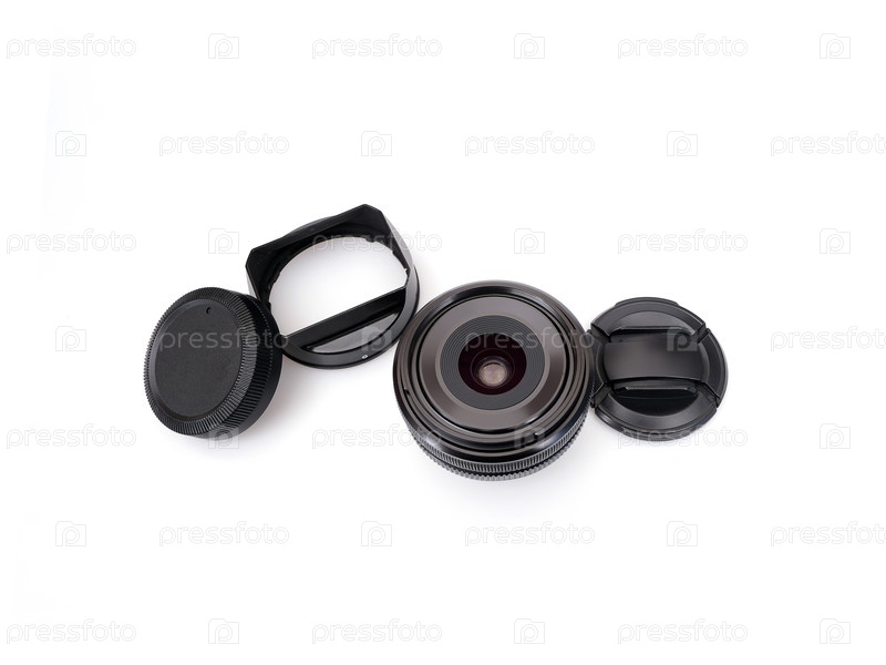 Фотообъектив и аксессуары изолированы на белом фоне