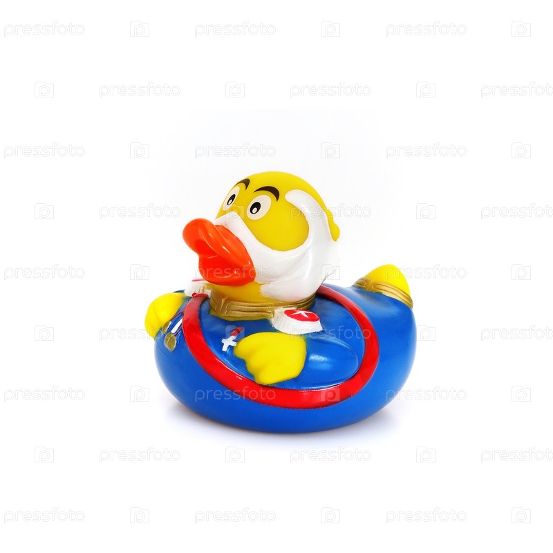 Забавная резиновая утка для плавания, изолированная на белом фоне