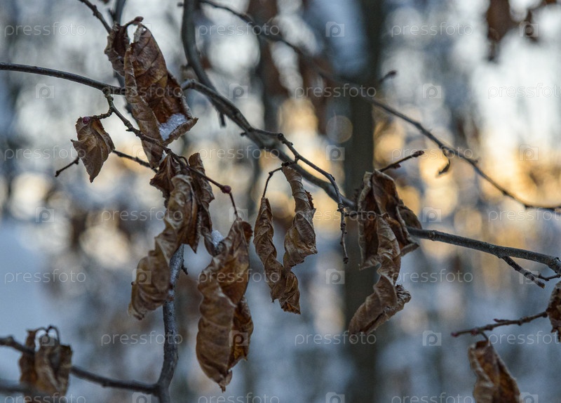 Сухие осенние листья висят на ветках в снежном лесу