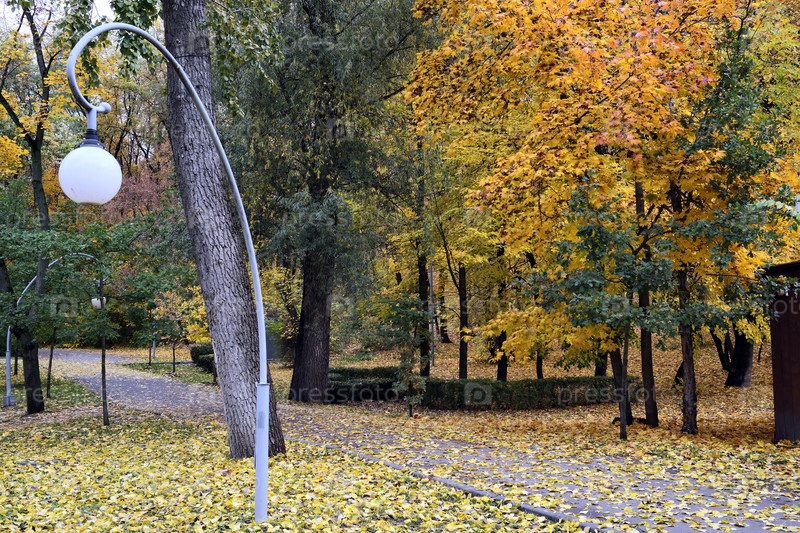 Уличный фонарь на пешеходной дорожке, покрытой упавшими листьями. Цвета осеннего листопадного леса. Центральный парк. Россия, Воронеж. 12 октября 2025