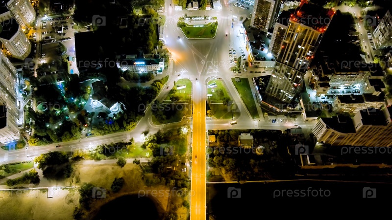 Саратов, Россия. Славянская площадь. Текст переводится как 'Саратов'. Панорама ночного города, вид с воздуха