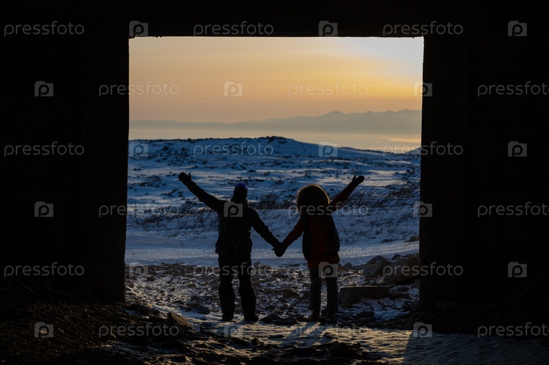 Силуэты на закате в горах