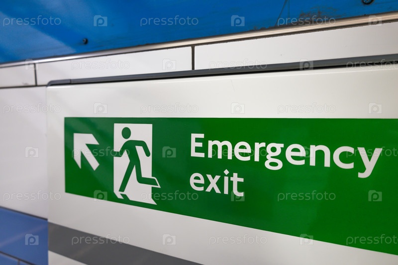 Зеленый знак экстренного выхода с иконой бегущего человека и направляющейся стрелкой, отображаемый на белой стене в зоне общественного транспорта