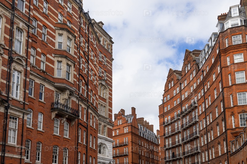 Низкий угол обзора исторических зданий из красного кирпича под облачным небом в классическом районе Лондона