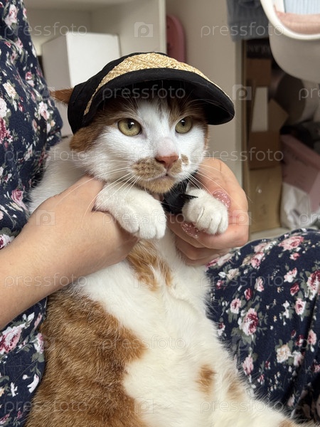 Женщина держит кошку, носящую солнцезащитный экран: ближайший снимок кошки