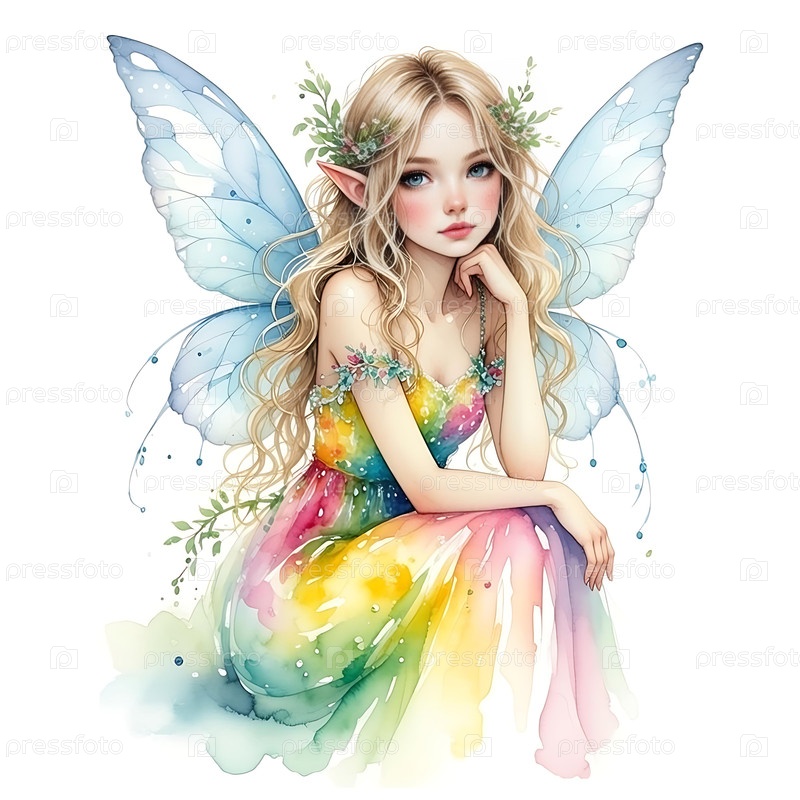 Очаровательная фея, сидящая и смотрящая на зрителя, нежная улыбка, акварельное искусство, JPG, 300dpi, белый фон - отлично подходит для иллюстраций книг, татуировок и чехлов для телефонов