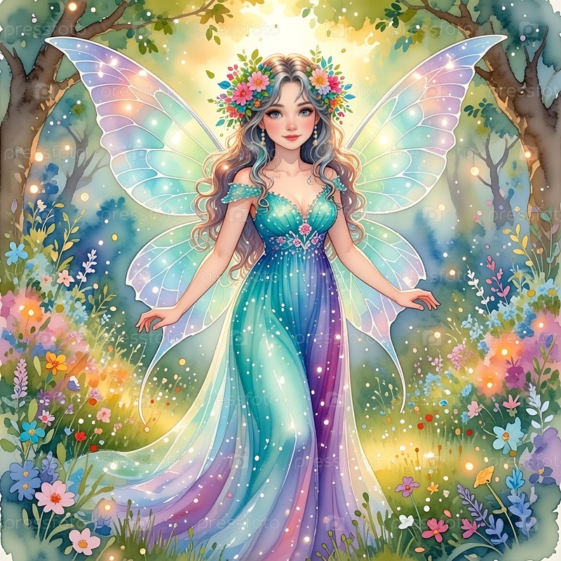 Элегантная фея, плавающая среди цветов и лучей света, акварельное искусство, JPG, 300dpi, белый фон - идеально подходит для медитационных приложений, обложек книг и стенового декора