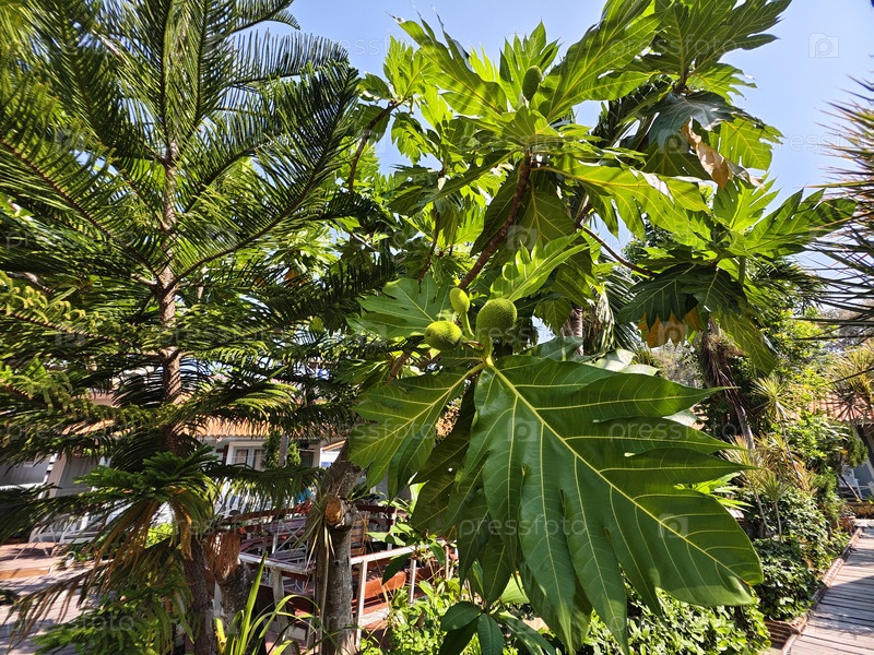 Тропический ландшафт в Таиланде: хлебное дерево (Artocarpus altilis) с листьями и фруктами
