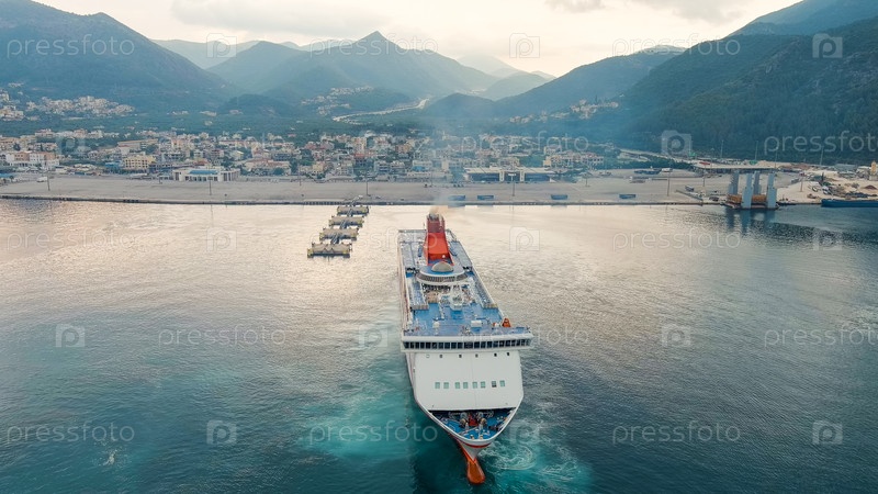 Большой паром, пришвартованный для разгрузки в порту Игуменица, Aerial View