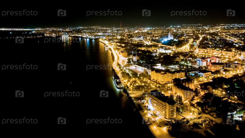 Астрахань, Россия. Волга, Петровский набережной. Городские ночные огни, вид с воздуха